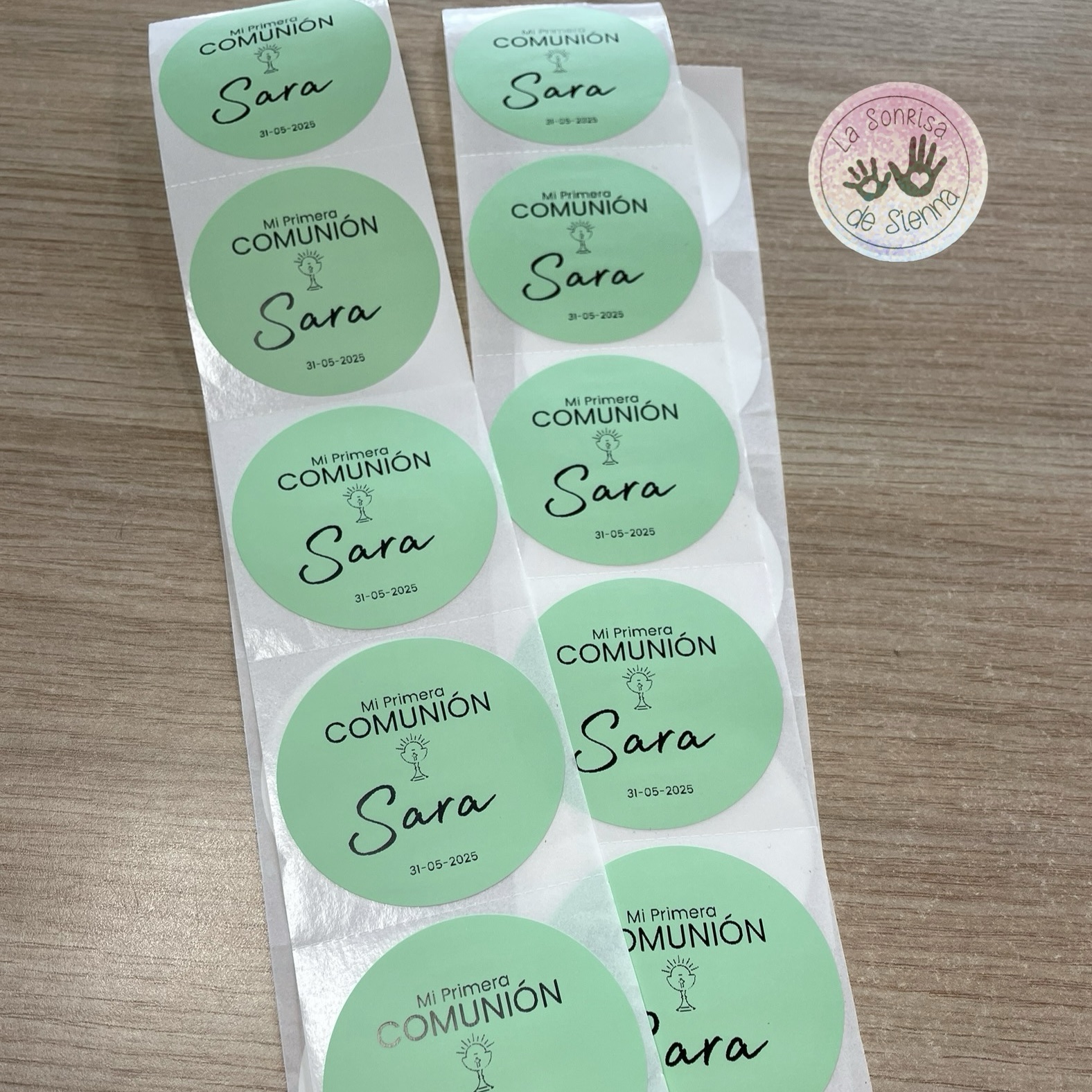 PACK de 50 pegatinas en color menta personalizadas con nombre, fecha y evento.