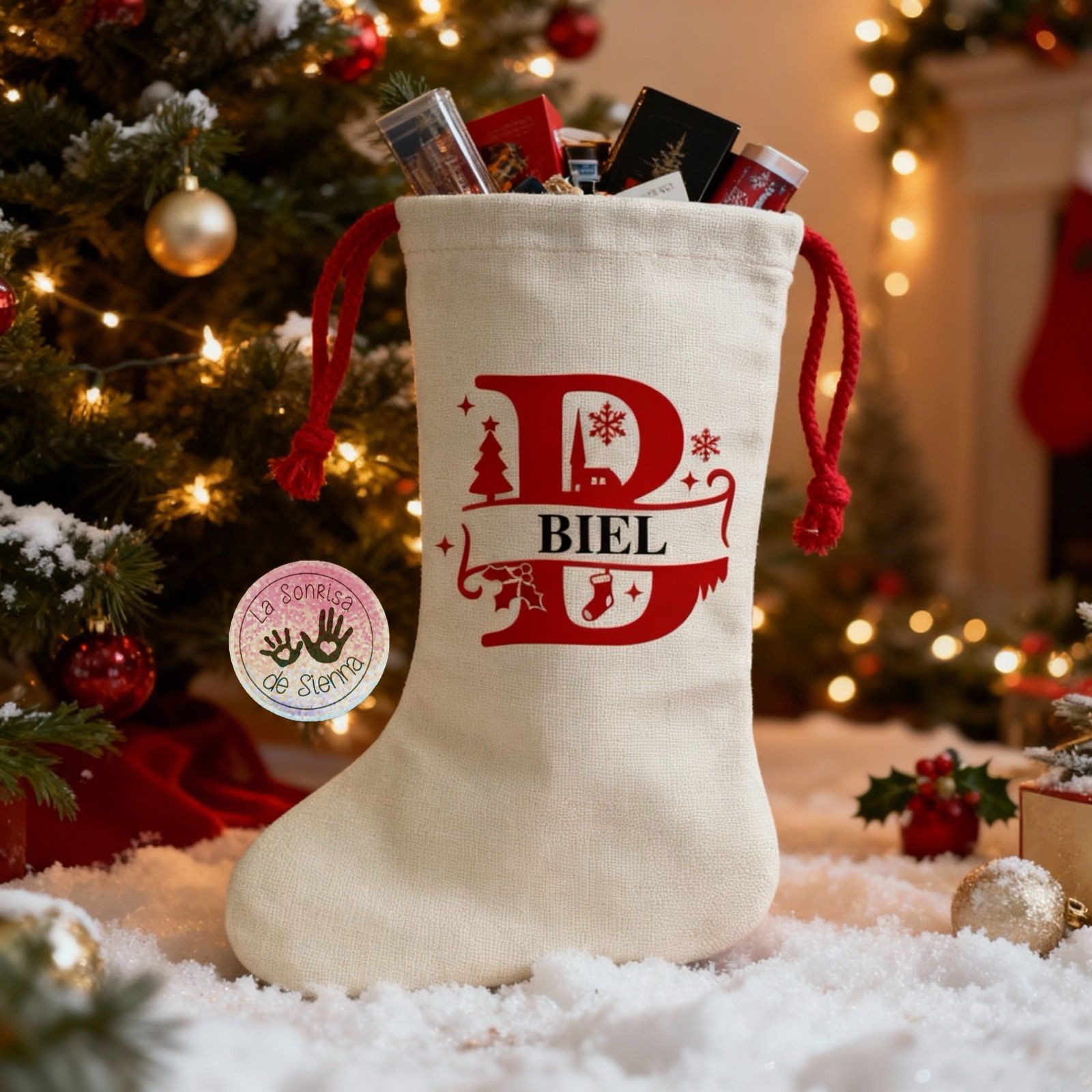 Bota navideña de lino personalizada con su inicial y nombre.