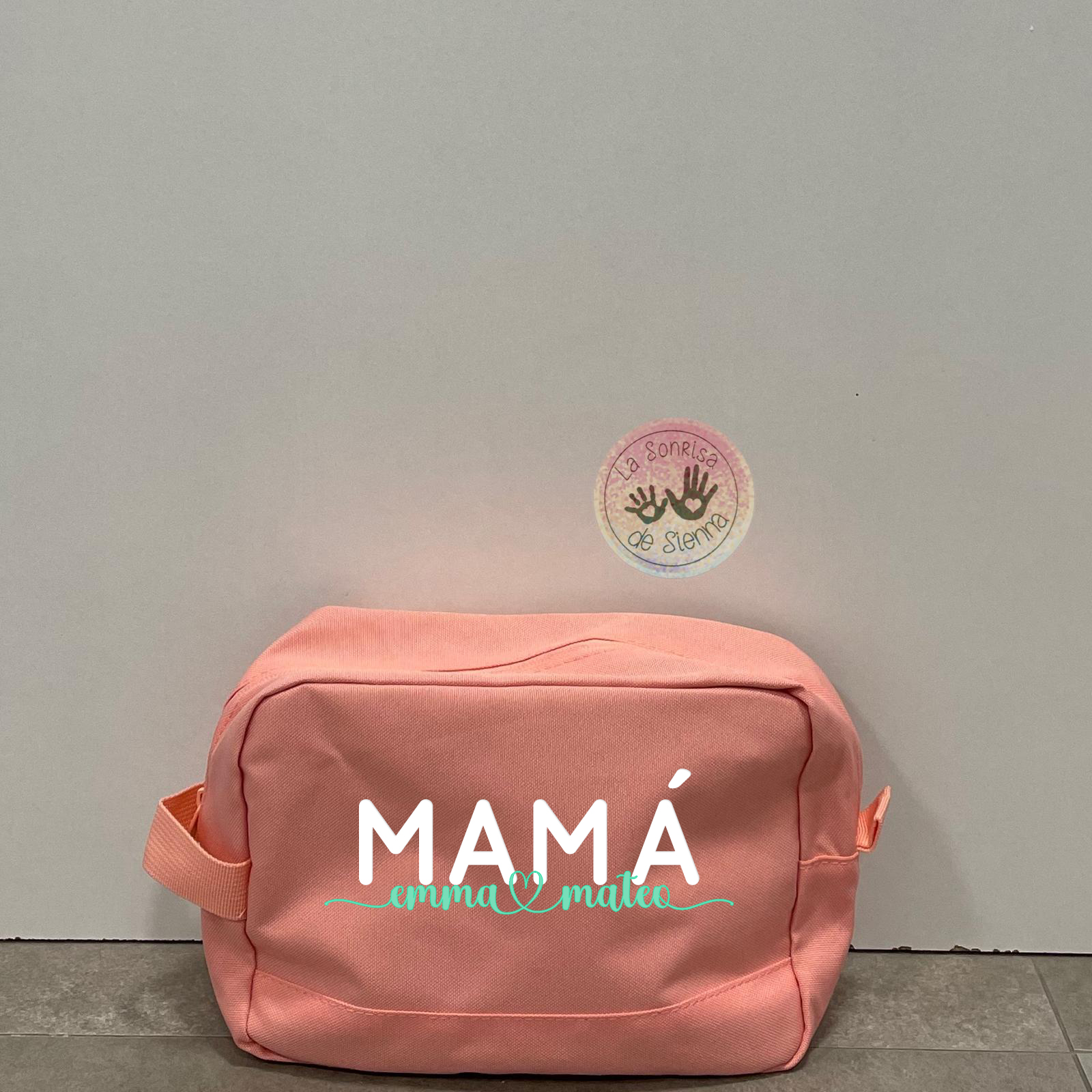 Neceser rosa coral personalizado con MAMÁ (en color blanco) y el nombre o nombres de tus peques.
