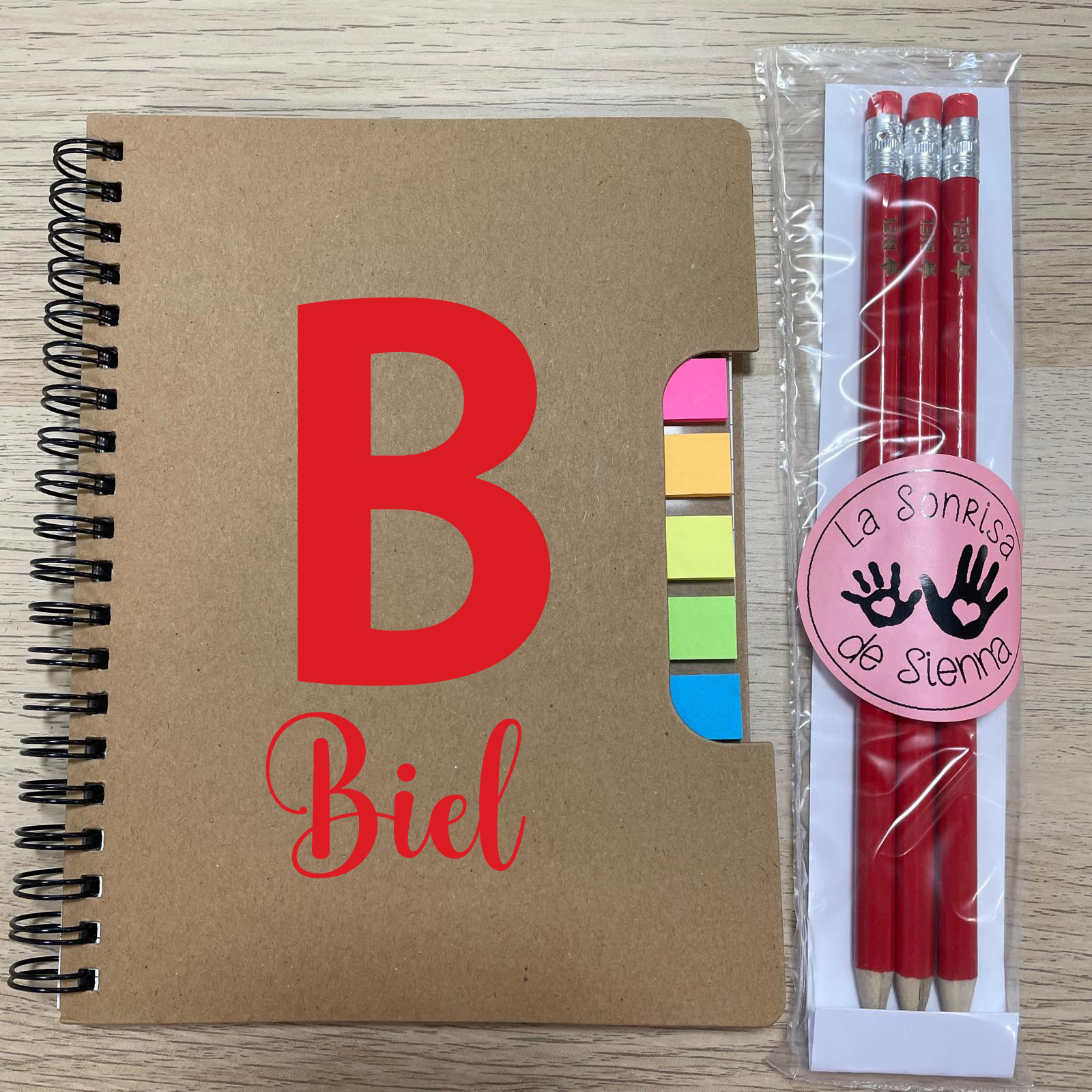 PACK de libreta personalizada con inicial y nombre a juego con 3 lápices personalizados con mismo nombre y dibujo