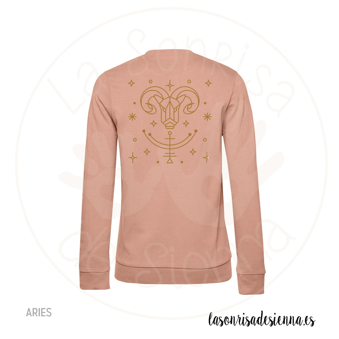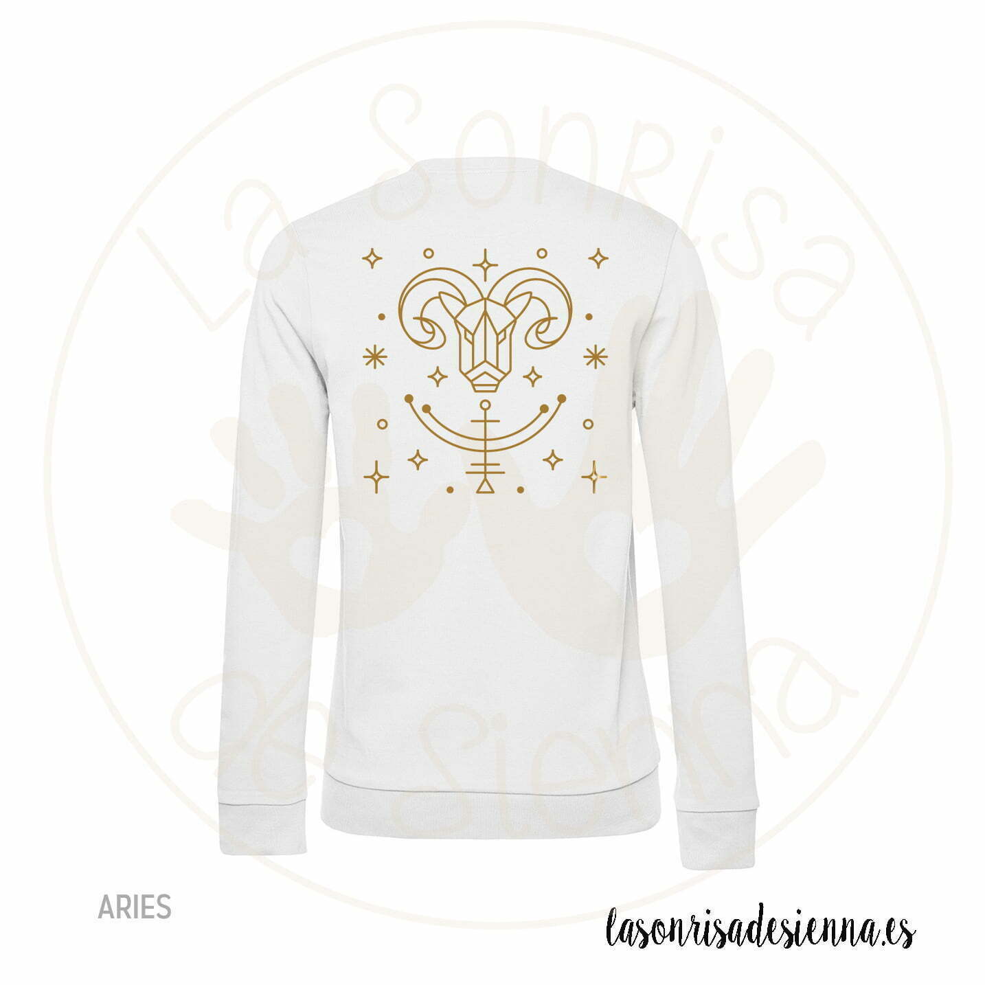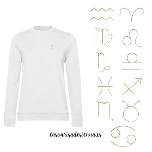 Sudaderas 80% algodón pre-encogido y 20% poliésteren de felpa ligera a eliger entre 4 colores: BLANCO, MENTA, ROSA NUDE Y NEGRO. Con dibujo en color dorado grande en la espalda y delante el logo del horóscopo.
