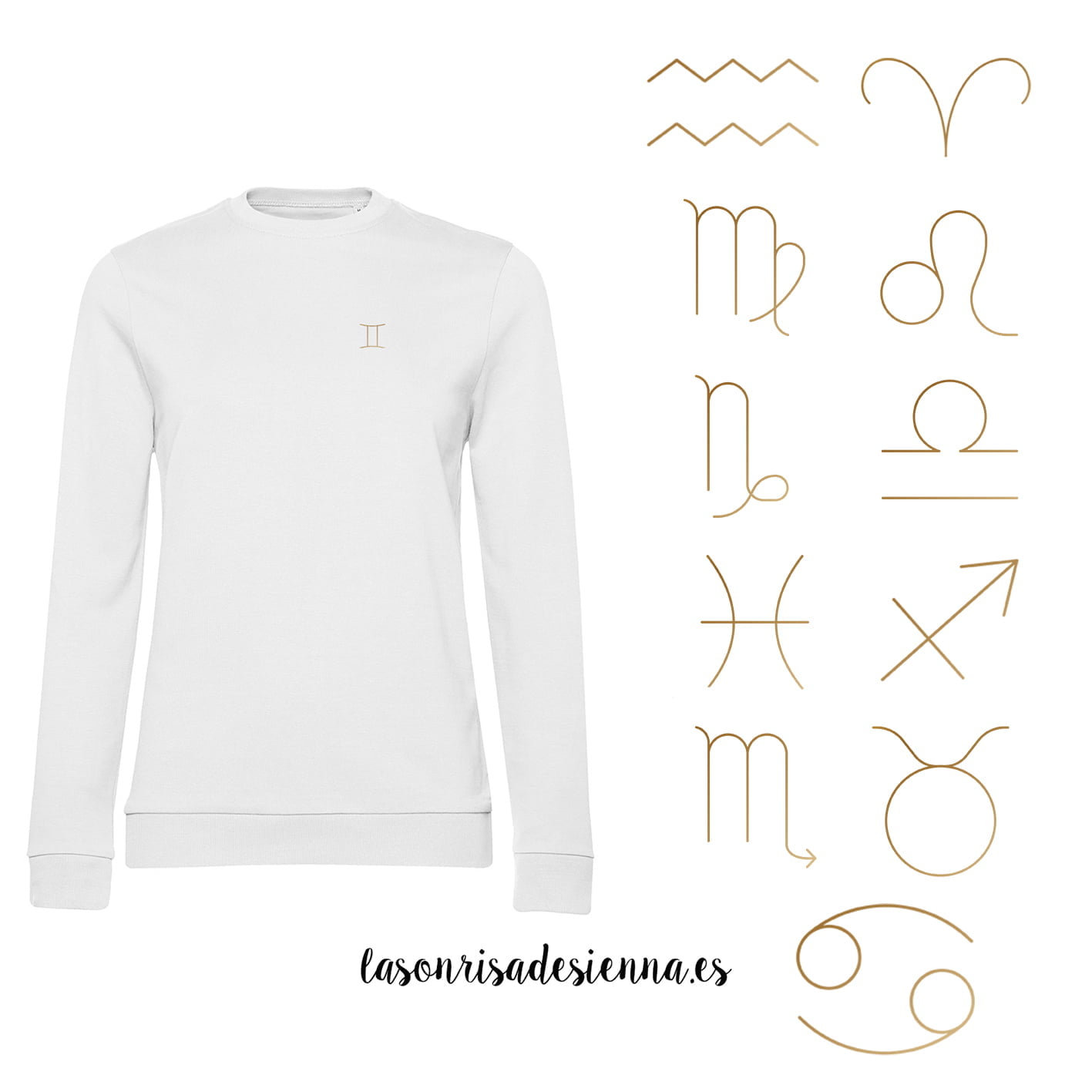 Sudaderas 80% algodón pre-encogido y 20% poliésteren de felpa ligera a eliger entre 4 colores: BLANCO, MENTA, ROSA NUDE Y NEGRO. Con dibujo en color dorado grande en la espalda y delante el logo del horóscopo.