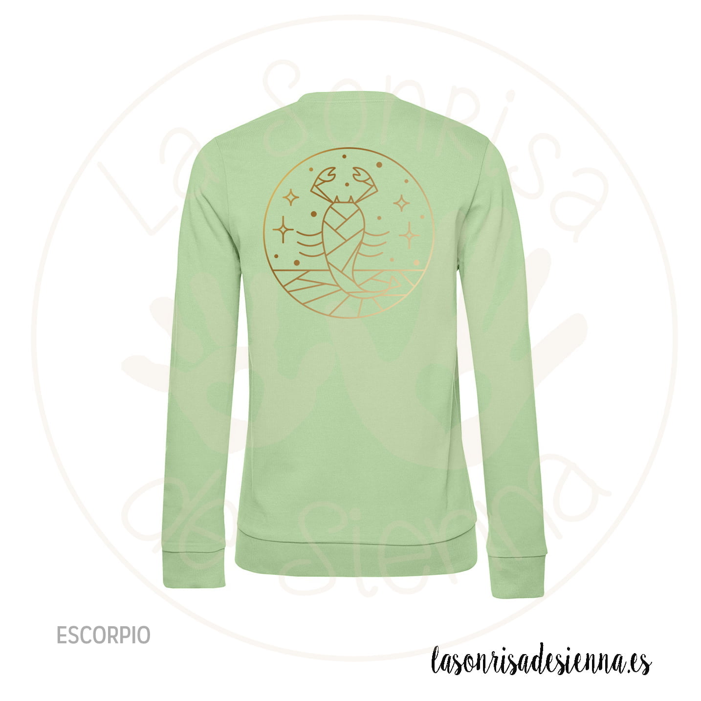 Sudaderas 80% algodón pre-encogido y 20% poliésteren de felpa ligera a eliger entre 4 colores: BLANCO, MENTA, ROSA NUDE Y NEGRO. Con dibujo en color dorado grande en la espalda y delante el logo del horóscopo.