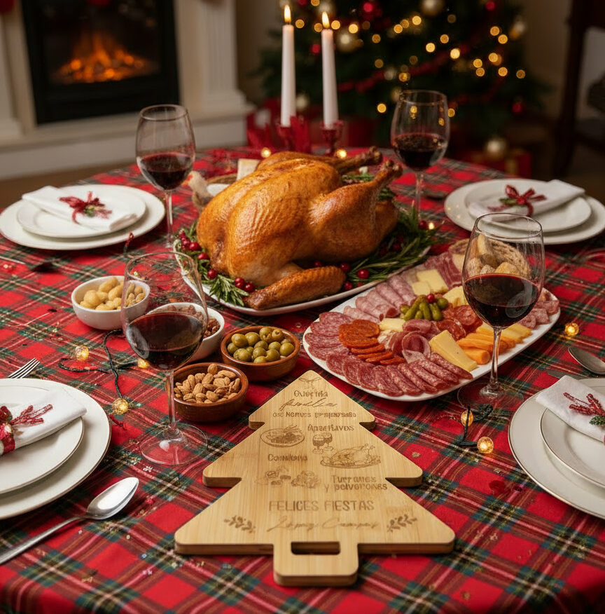 Tabla en forma de abeto de Navidad personalizada con los apellidos o nombres de la familia fabricada en bambú. Ideal para decorar tu mesa navideña.