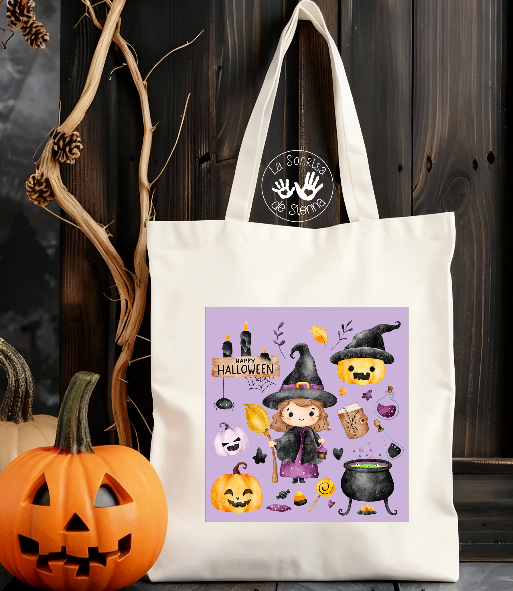 Bolsa de algodón reutilizable (38x42cm) con asa larga ideal para ir de TRUCO O TRATO. Si quieres personalizarlo con su nombre escríbenoslo en el apartado de mensajes del pedido.